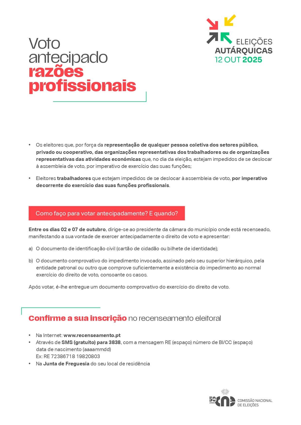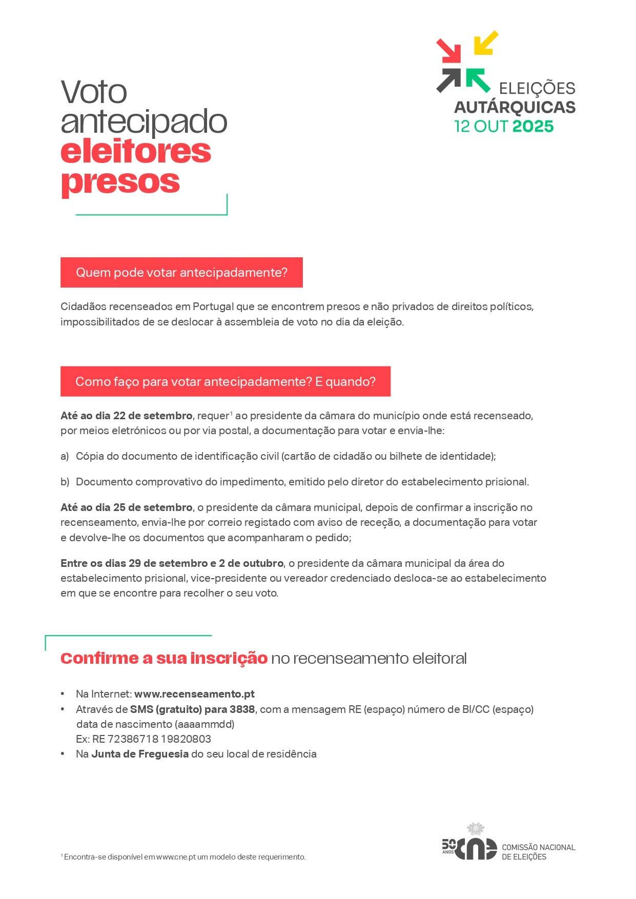 Na Eleição dos Órgãos das Autarquias Locais, de 12 de outubro de 2025, o modo de exercício do direito de voto antecipado, em território nacional, abrange: